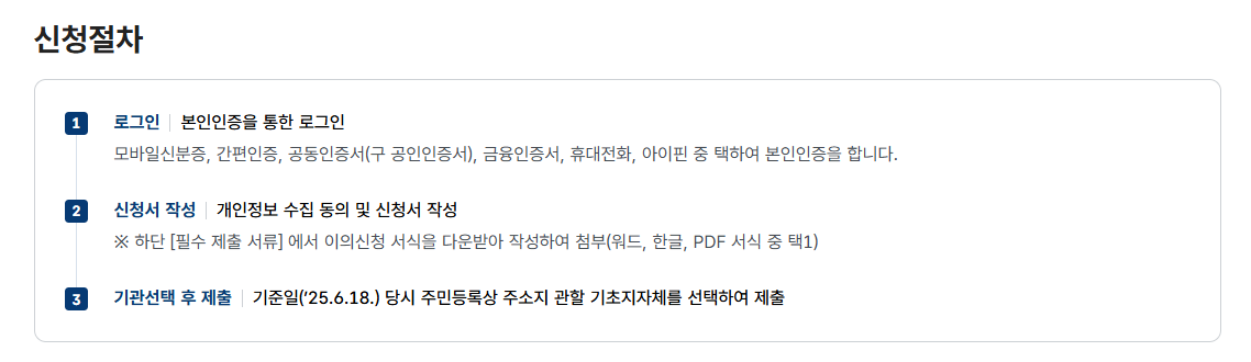 | 오프라인 | 주소지 관할 읍·면·동 주민센터 방문하여 서면 접수 (신분증, 증빙서류 지참) |