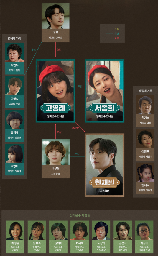 등장인물관계도는 영례와 종희가 중심이며, 재필과의 감정선이 핵심 축을 이룹니다.